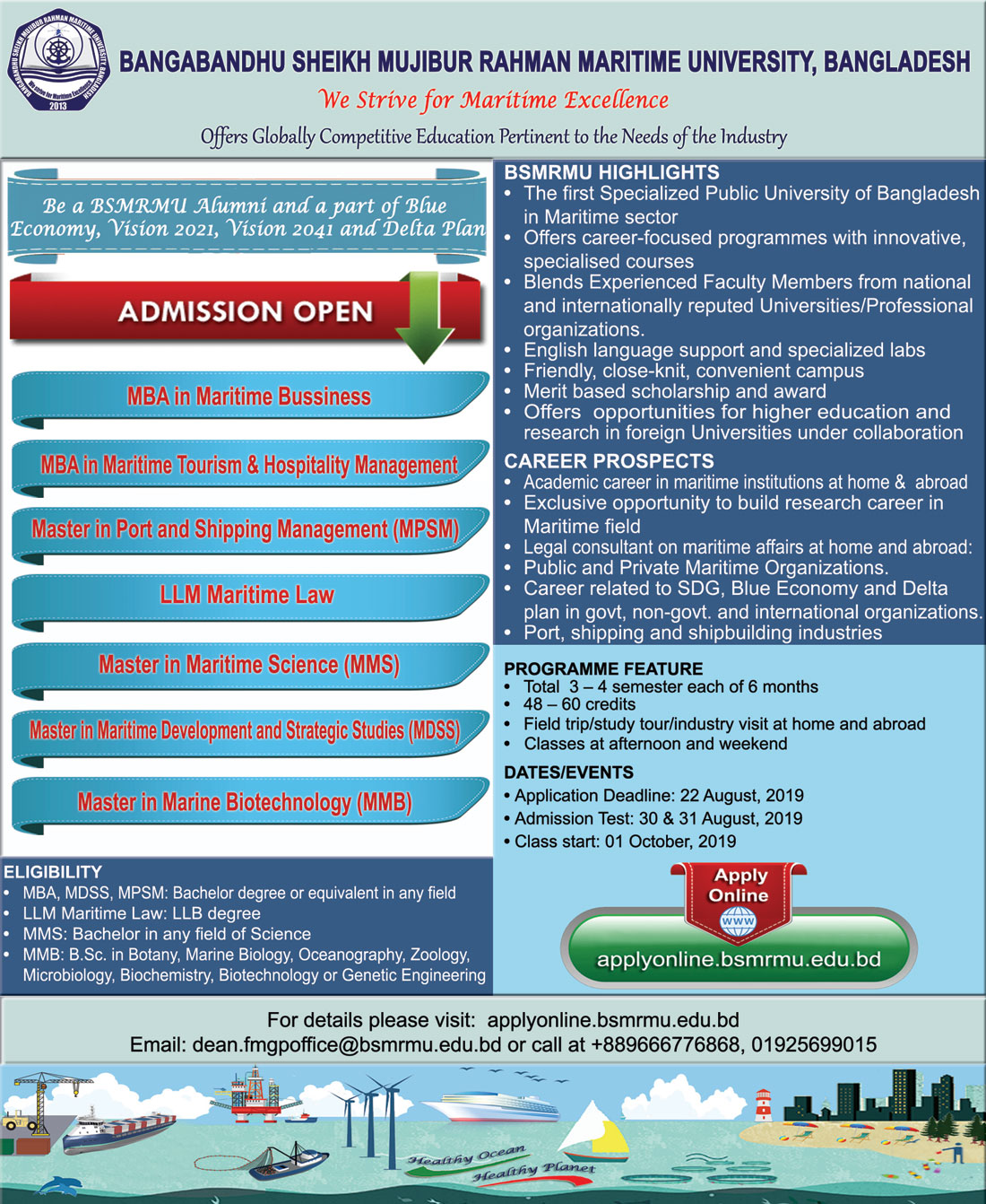 Bangabandhu Sheikh Mujibur Rahman Maritime University (BSMRMU), Bangladesh is inviting application from interested candidates for admission in the following full time master degree programmes for the academic session 2019-2020: