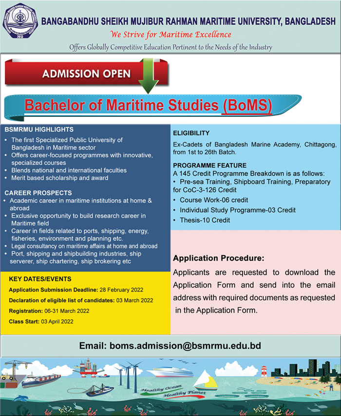 Admission Open: Bachelor of Maritime Studies (Eligibility: Ex- Cadets of Bangladesh Marine Academy, Chittagong from 1st to 26th Batch)