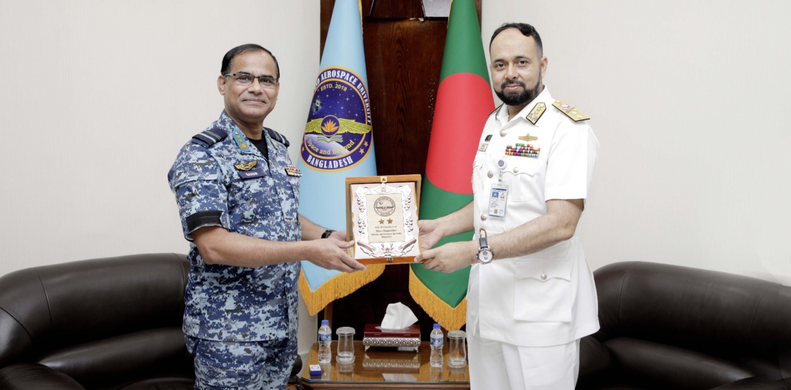The new appointed honourable Vice Chancellor of Bangladesh Maritime University (BMU) Rear Admiral Dr. Khandakar Akhter Hossain, NUP, ndc, psc, PhD paid a courtesy call on with the honourable Vice Chancellor of Aviation and Aerospace University, Bangladesh (AAUB) Air Vice Marshal A K M Manirul Bahar, OSP, BSP, ndc, hdmc, afwc, psc, ADWC on 15 May 2025 at the AAUB temporary campus at Dhaka. He had a fruitful discussion with the Vice Chancellor of AAUB describing the ongoing academic and administrative activities of the university at its temporary campus. He has also informed the VC, AAUB about the ongoing construction works of establishing Bangladesh Maritime University's permanent campus at Hamidchar, Chattogram. At that time the VC AAUB assured the Vice Chancellor of BMU to whole hearted support to smooth journey of the university. They had also agreed to work together on the prospects of mutual collaboration, development of higher education and joint research, publication and any other field of the universities. The Pro-Vice Chancellor, Treasurer and Registrar of AAUB accompanied at the call on.